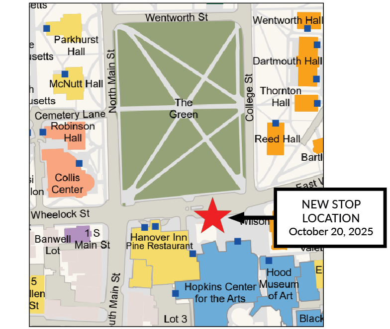 Beginning Monday, October 20, 2025, Dartmouth Coach will pick up and drop off in front of Hopkins Center for the Arts on Wheelock Street in Hanover, NH.